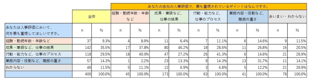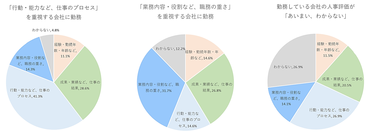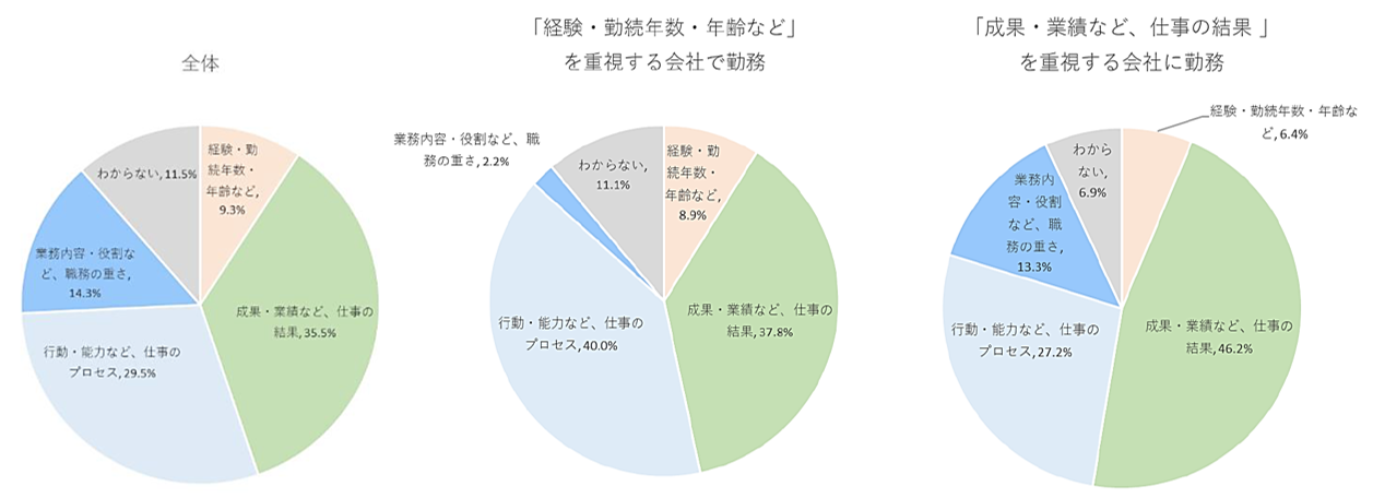 しかし、現在勤務する会社が「経験・勤続年数・年齢など」を重視していると答えた回答者グループでは、「経験・勤続年数・年齢など」を望む割合が全体での割合を下回り、「経験・勤続年数・年齢など」を重視して評価することは、それを重視している会社に勤務している社員からも望まれていないという状況が伺える結果となった。