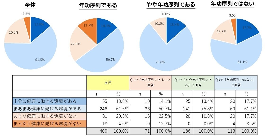 「健康に働ける環境が「ある」」と答えた割合がもっとも高かったのは、Q3で「やや年功序列である」と答えた回答者グループで、89.2%が「健康に働ける環境が「ある」」(十分に健康に働ける環境がある(13.4%)、まあまあ健康に働ける環境がある(75.8%))と答え、Q3で「年功序列ではない」と答えた回答者グループを上回った。