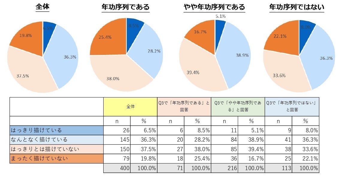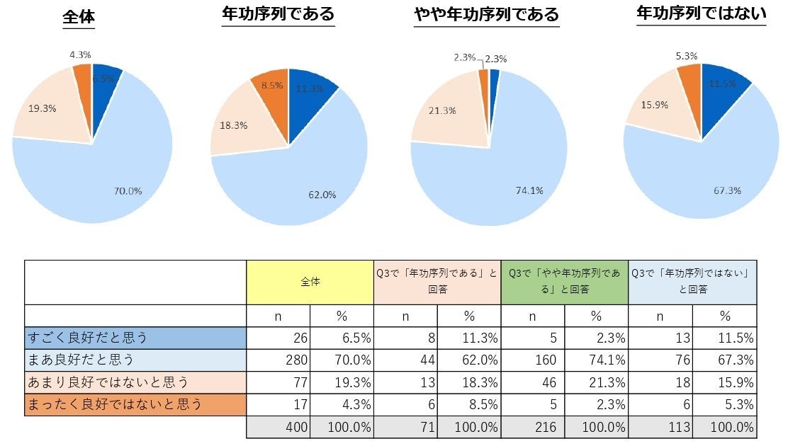 もっとも「良好だと思う」割合が高かったのは、Q3で「年功序列ではない」と答えた回答者グループで、78.8%が「良好だと思う」(まあ良好だと思う(67.3%)、すごく良好だと思う(11.5%))と答えた。