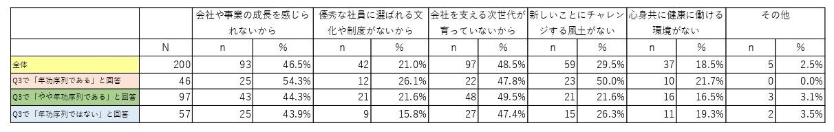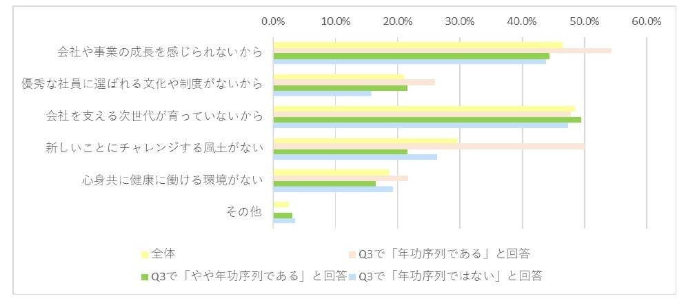 一方、Q3で「年功序列である」と答えた回答者グループのみの特徴として、「将来性を「感じない」」理由として、「新しいことにチャレンジする風土がない」(50.0%)を挙げる割合が、他グループに比べ著しく高く、「年功序列である」グループ特有の問題が、明らかになった。