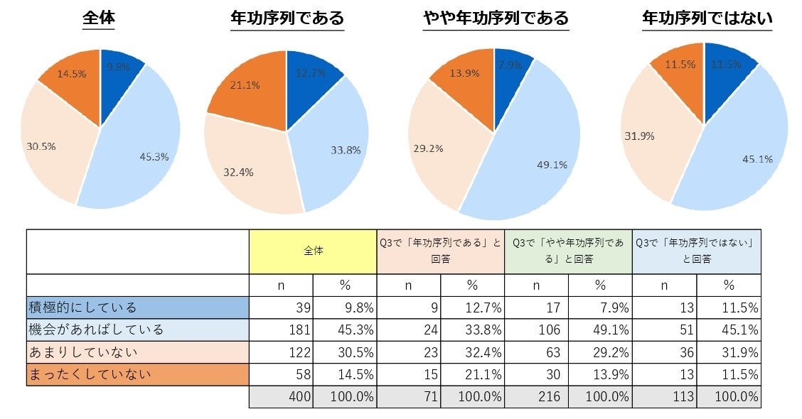 「新しいスキルや知識を身につけるための行動をしていますか。(単数回答)」との質問(Q9)でも、「新しいスキルや知識を身につけるための行動を「していない」」と答えた割合が最も高かったのは、Q3で「年功序列である」と回答したグループで、53.5%が「新しいスキルや知識を身につけるための行動を「していない」」(あまりしていない(32.4%)、まったくしていない(21.1%))と答えた。