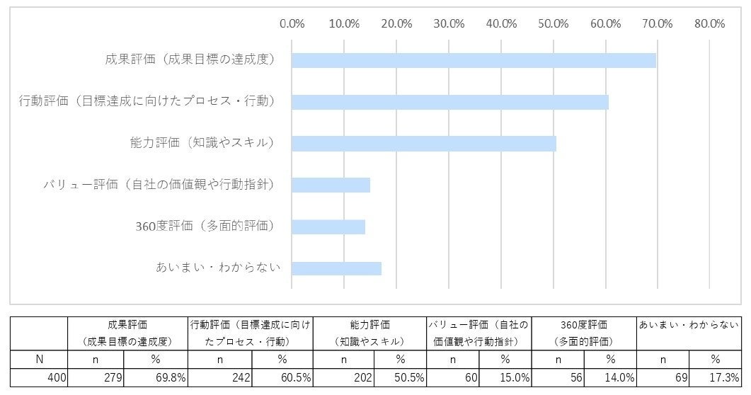 次いで「行動評価(目標達成に向けたプロセス・行動)」(60.5%)、「能力評価(知識やスキル)」(50.5%)となった。
