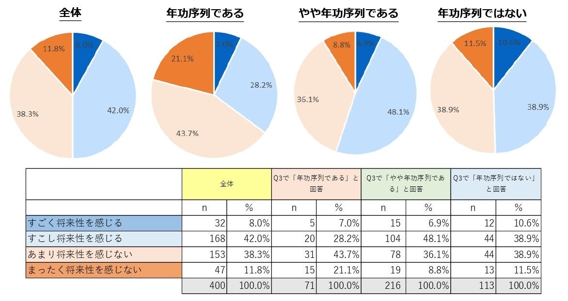 「将来性を「感じる」」と答えた割合がもっとも高かったのは、Q3で「やや年功序列である」と答えた回答者グループで、55.0.%が「将来性を「感じる」」(すごく将来性を感じる(6.9%)、すこし将来性を感じる(48.1%))と答え、Q3で「年功序列ではない」と答えた回答者グループ(すごく将来性を感じる(10.6%)、すこし将来性を感じる(38.9%))を上回ったが、「すごく将来性を感じる」という回答だけに限ると、「年功序列ではない」回答者グループのほうが、3.7%上回った。