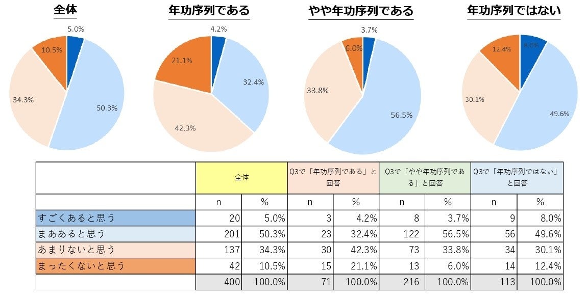 「やりがいを持って働ける環境が「ある」」と答えた割合がもっとも高かったのは、Q3で「やや年功序列である」と答えた回答者グループで、60.2%が「やりがいを持って働ける環境が「ある」」(すごくあると思う(3.7%)、まああると思う(56.5%))と回答したが、「年功序列ではない」回答者グループとの差は、2.6%にとどまった。