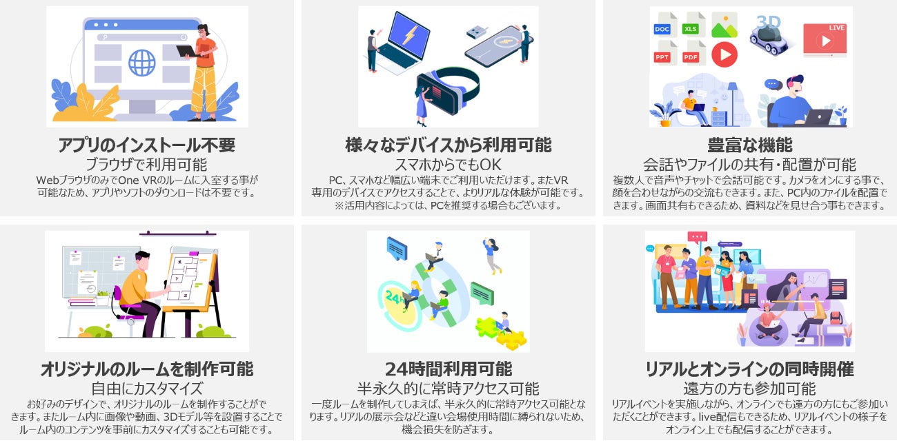 VR空間の中で、音声会話・チャット・画面共有が可能なため、テレビ会議や動画配信だけではできなかった様々な交流がOne VRでは可能になります。