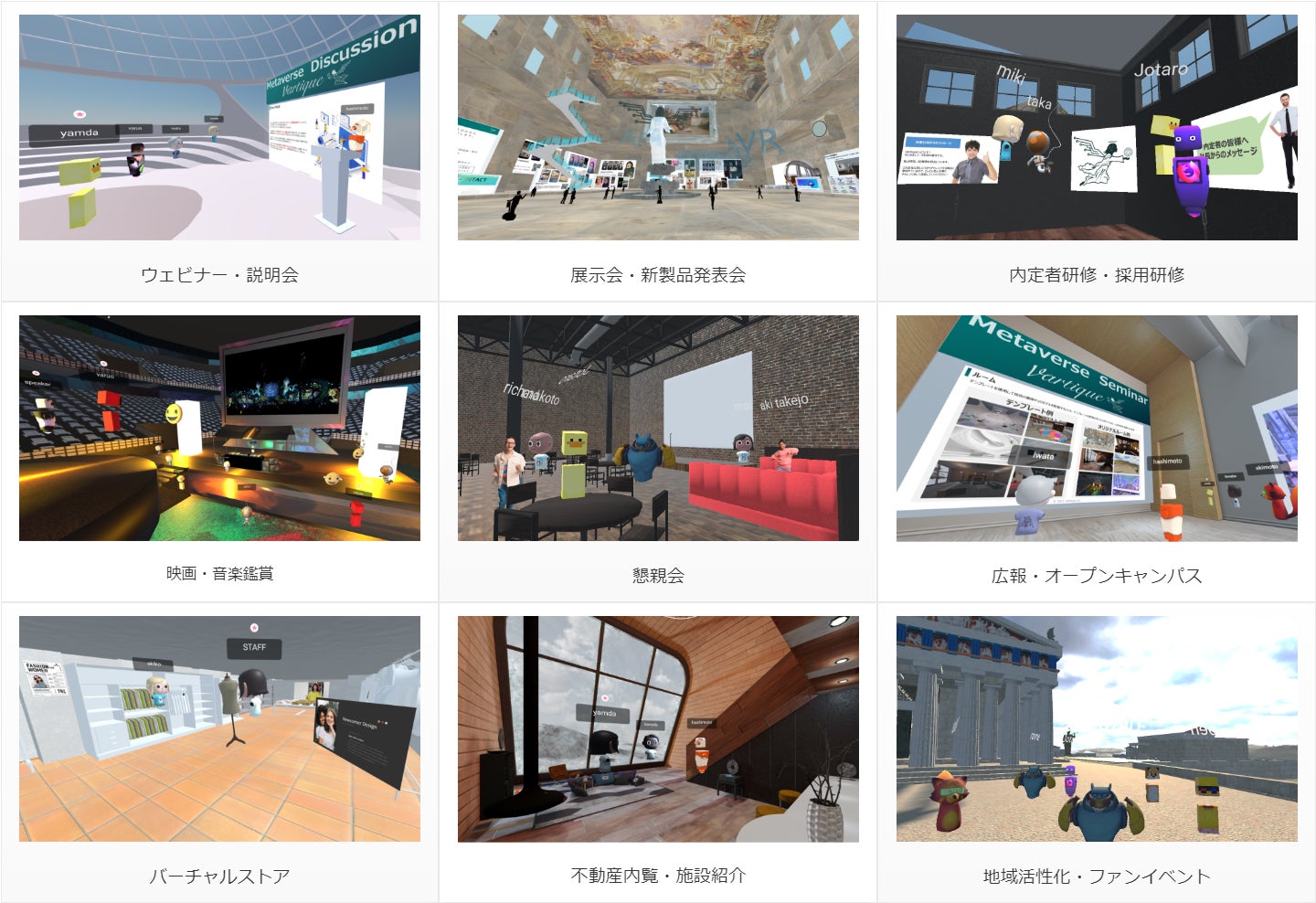 例)ウェビナー・説明会、展示会・新商品発表会、内定者研修・採用研修、映画・音楽鑑賞、懇親会、広報・オープンキャンパス、バーチャルストア、不動産内覧・施設紹介、地域活性化・ファンイベント