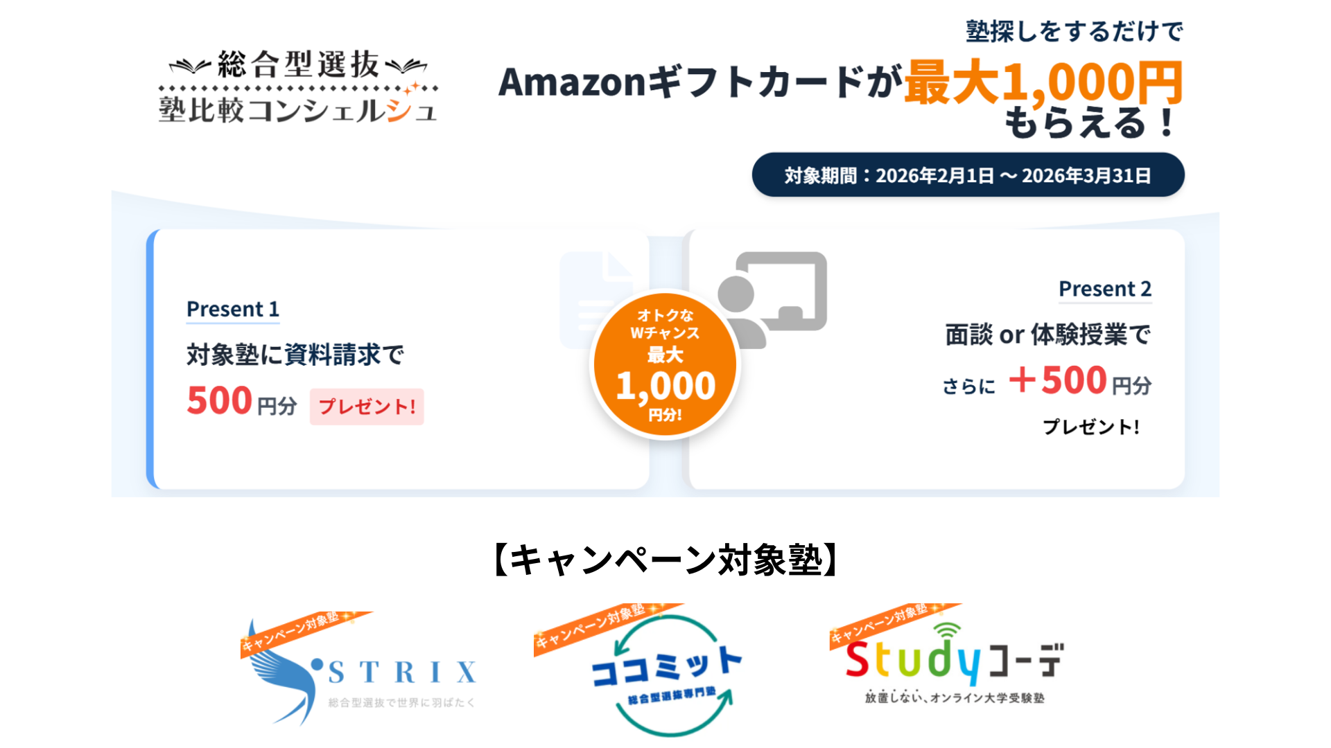 そこで、2026年3月末までの期間中、当サイトを通じて対象塾へ資料請求や面談を行い、慎重に比較検討を行ってくださった受験生へ、ささやかながらAmazonギフトカードを贈呈することにいたしました。このキャンペーンが、納得のいく塾選びへの一歩を後押しするきっかけになれば幸いです。