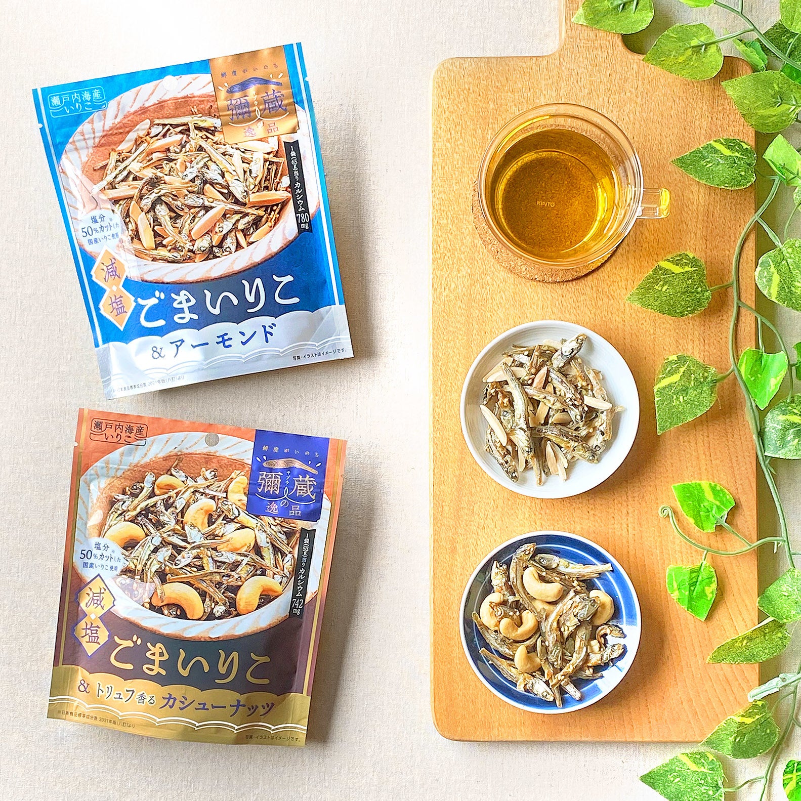 1901年創業の老舗、石丸弥蔵商店が確かな目利きで厳選した瀬戸内海産の海産乾物を贅沢に活かした、こだわり志向の方にご愛顧いただいているシリーズです。瀬戸内海産の生のりの風味を活かし、こだわりの衣でサクサクに揚げた、あごだし風味の「弥蔵の逸品 だしのり天」、鮮度が良く大きめの瀬戸内海産いりこに焙煎した金ごまを付け、いりこをけんぴに仕上げた「弥蔵の逸品 金のいりこけんぴ」に加えて、今回、減塩タイプの2品「弥蔵の逸品 減塩 ごまいりこ&アーモンド」「弥蔵の逸品 減塩 ごまいりこ&トリュフ香るカシューナッツ」が新しく仲間入りいたしました。