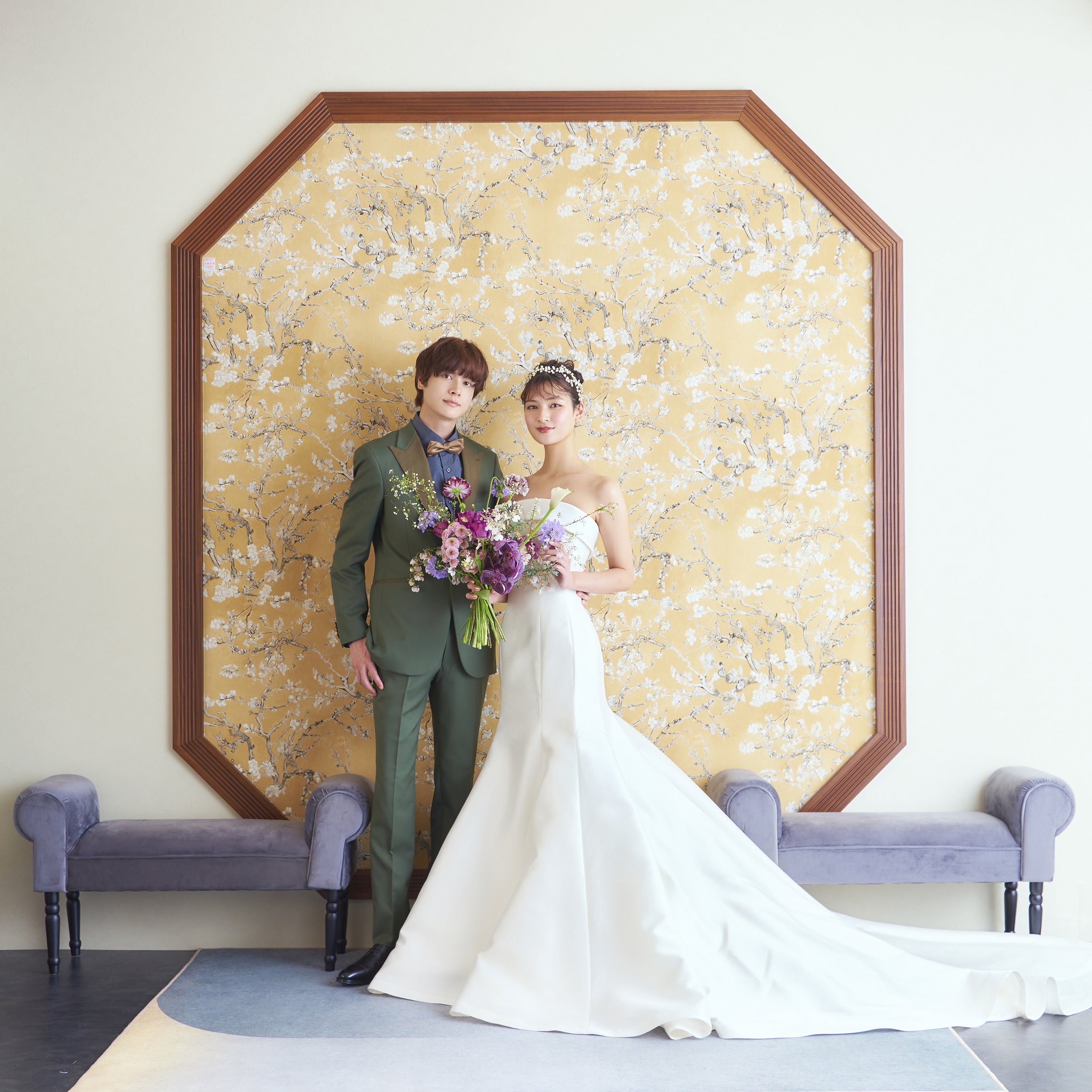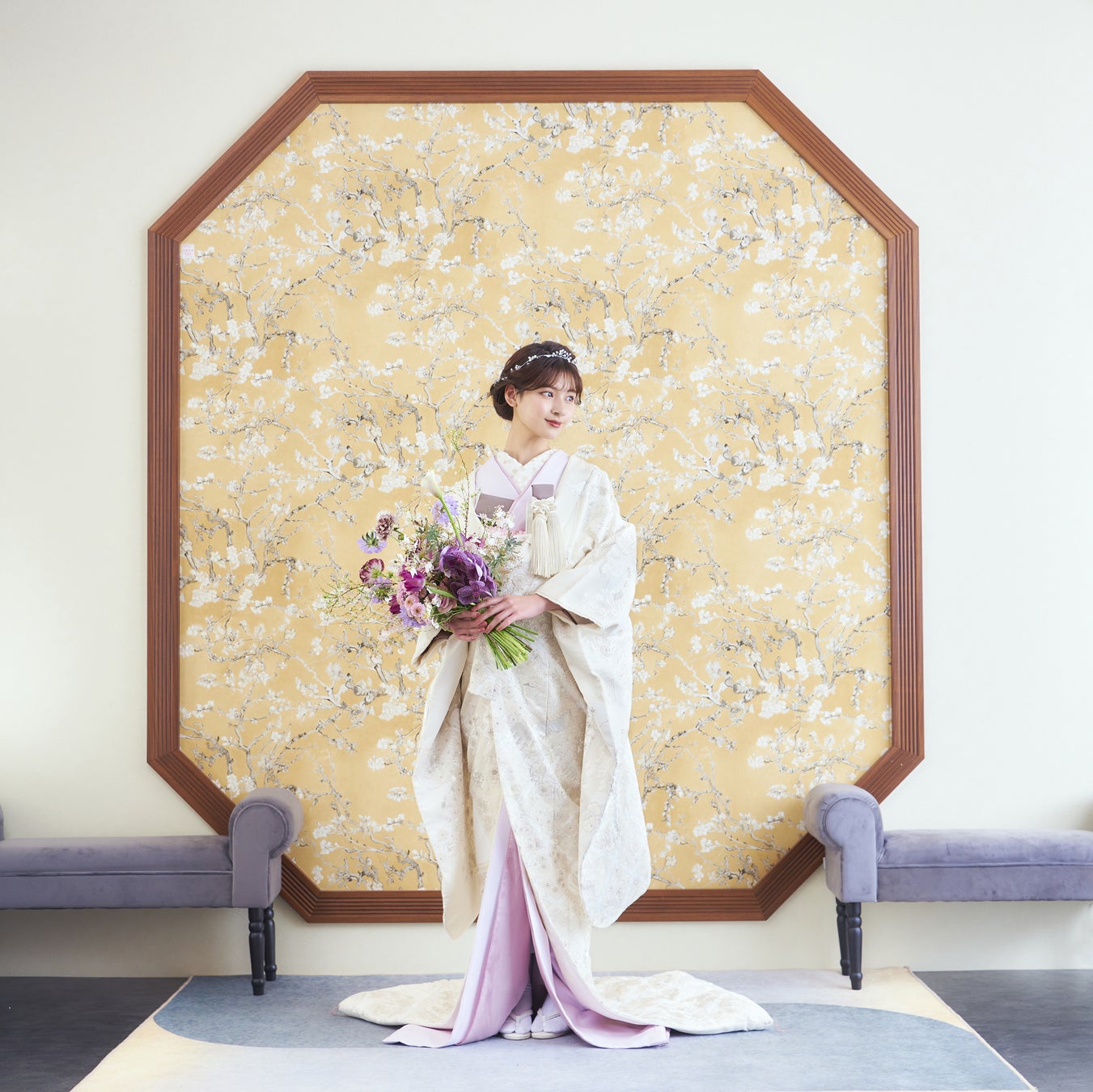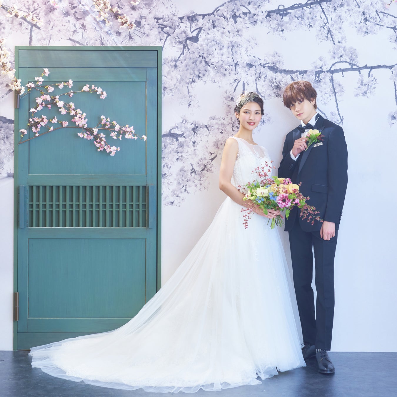 壁面に描かれた桜に立体の造形美が織りなす美しい背景セット。 モダンな扉が満開の桜を引き立たせます。二人だけの貸し切り空間で撮影できる、桜ウェディングフォトを体験いただけます。