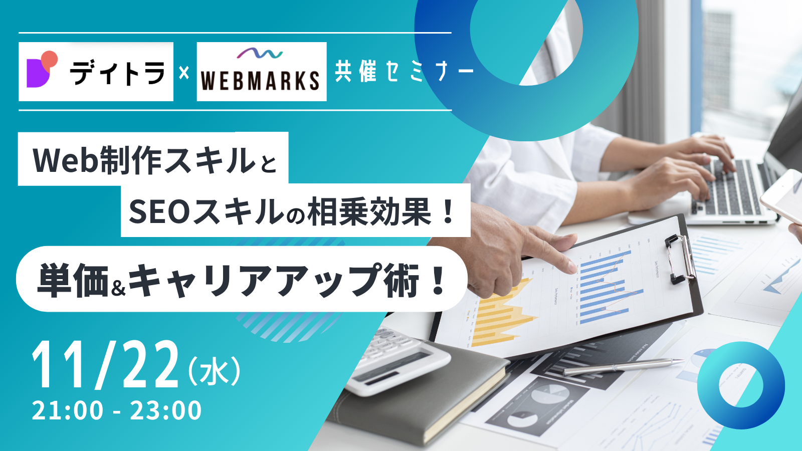 そんな背景から、これまで多くのSEOマーケターを輩出してきた株式会社WEBMARKSと、WEB制作やWEBデザイン、Pythonなどのプログラミング言語、動画編集など幅広いコースを受講できるオンラインスクールを運営している株式会社デイトラで、Web制作スキルとSEOスキルを掛け合わせた単価・キャリアアップの方法についてお伝えする共催セミナーを開催いたします。