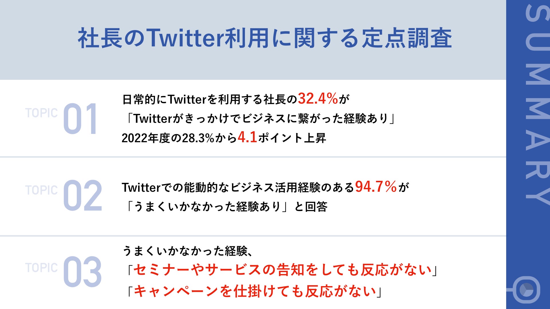 【定点調査:Twitterを利用する社長のビジネス活用実態】3割以上が、Twitterがきっかけでビジネスにつながった経験あり!昨年比4.1ポイント上昇