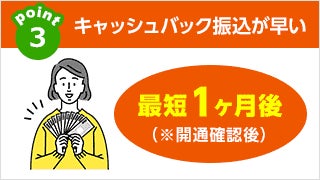 キャッシュバックが早い!なんと最短1ヶ月後には、指定の口座へ現金をお振込致します。当社が選ばれる大きな理由の1つです。