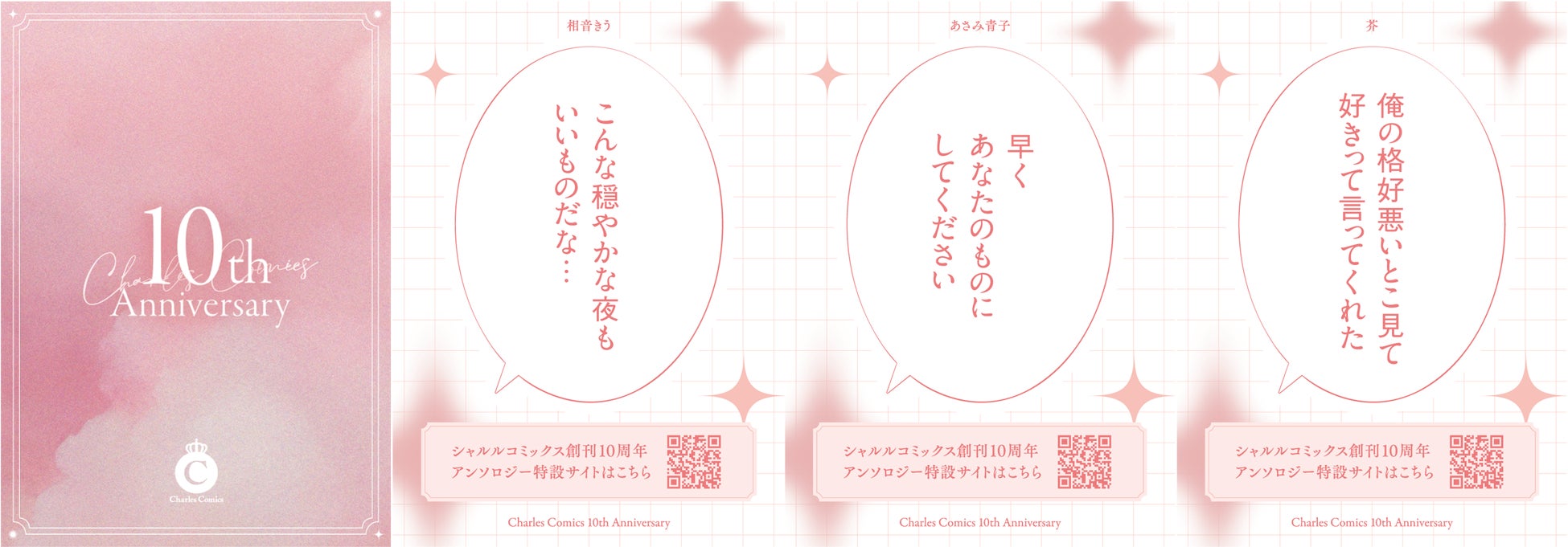「広告」となると、シャルルコミックスの「読者」の方に向けることが多くなるものだと思いますが、三交社のみなさまとお打ち合わせを重ねていく中で、読者の皆様はもちろん、素敵な作品を描いてくださる作家の皆様、ともに作品を作り上げる編集の皆様、色々な人たちによってシャルルコミックスは作られ、10周年という歴史を積み上げてきたのだと感じました。今回の広告掲載はこれまでシャルルコミックスに関わって来られたすべての方々に対して、そしてこれからシャルルコミックスに関わる方々の思い出の一つになるように話し合いを重ね掲載に至りました。