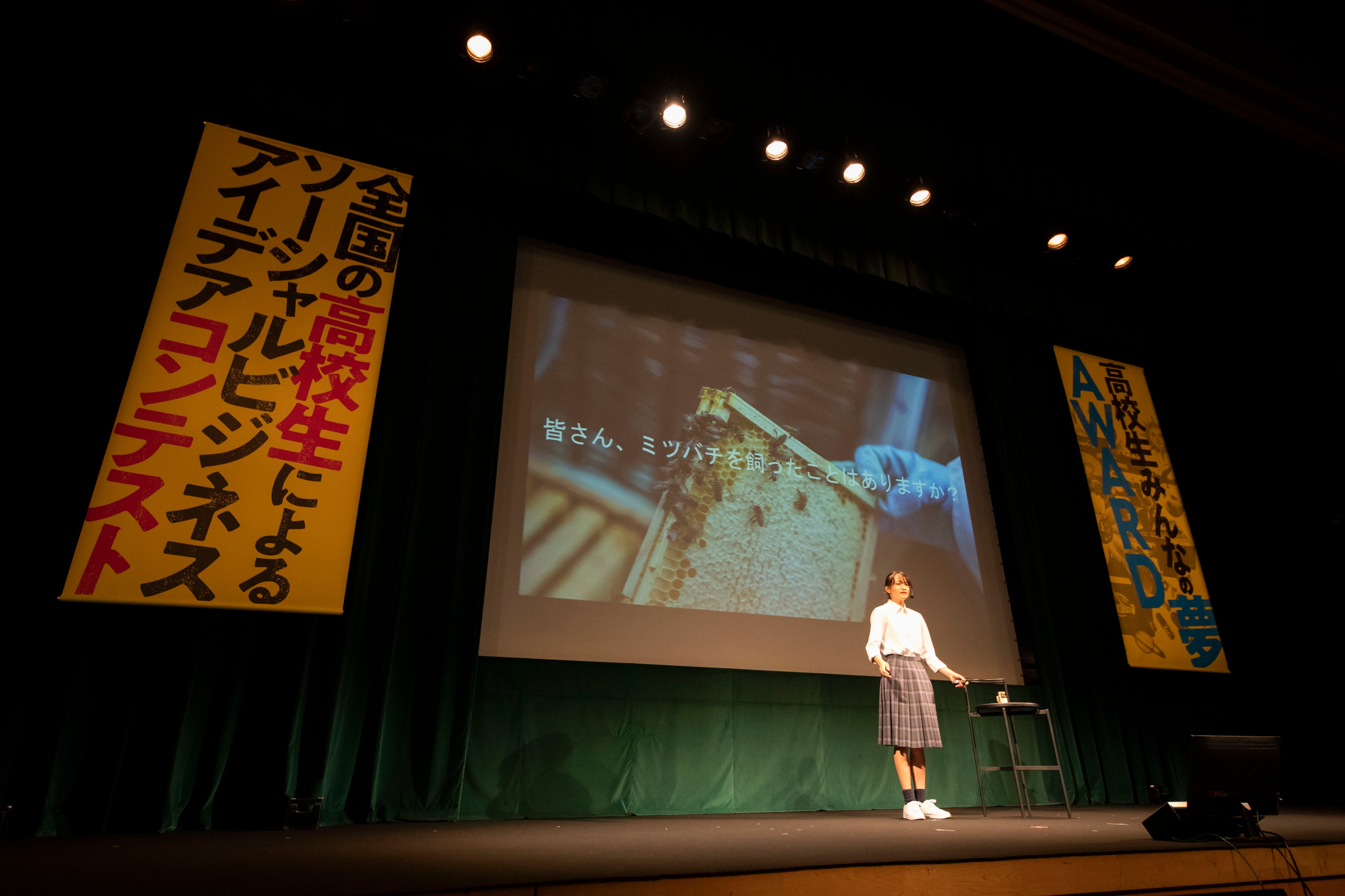 グランプリに選ばれたのは、「都市蜜源を有効活用せよ!!」というビジネスプランを発表した山路菫さん。山路さんは、学校のテラスで養蜂を行い、採取したハチミツを販売した経験から、他の都市や住宅密集地でも養蜂が可能だと考え、学校・マンション・ビルの屋上での養蜂事業を立案しました。日本の食糧自給率の向上に貢献しながら、学校の生徒に食育やビジネス教育の機会を提供したいとの思いを発表し、見事グランプリを受賞。