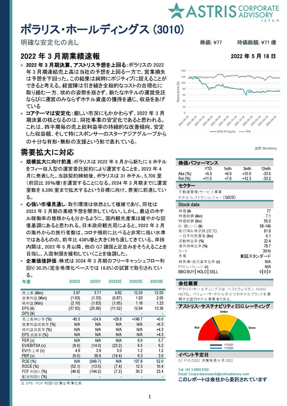 【企業レポート】ポラリスHD(東証:3010|ホテル運営)の投資家向け企業レポート2022年3月期決算版がアストリス・アドバイザリー・ジャパンから配信されました。