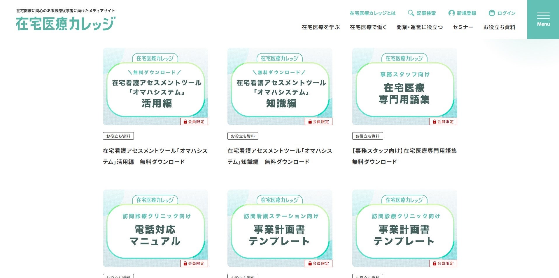 「在宅医療カレッジ」では最新情報の記事コンテンツの他、より詳しく実践的なお役立ち資料も豊富にご提供。どなたでも無料の会員登録をしていただくと、いつでもすべてのコンテンツや資料にアクセスいただけます。会員限定で記事更新やセミナー情報の受け取りもでき、業界動向をいち早くチェックできます!