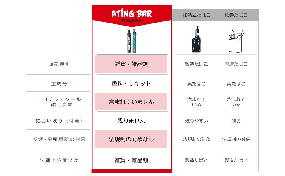また、紙たばこなどは燃焼による煙が匂い成分となって強く吸着してしまいますが、ATING BARは水蒸気のため匂いが残らずお楽しみいただけます。