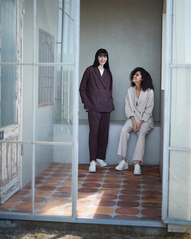 新たにアクティブウエアに加わったLAYERED LONG SLEEVE TOPは、ペットボトルリサイクルポリエステルを採用し、深めのVネックがデコルテを美しく演出し、アクティブシーンをスタイリッシュに昇華します。Cozyな温もり感じるソフトな肌触りのメリノウールを採用したLONG SLEEVE SWEATER DRESSをはじめ、ドライタッチで心地よい着用感とストレッチ性を備えたDOUBLE BREASTED BLAZERと、同素材で裾にスリットをあしらったWIDE STRAIGHT PANTSはセットアップで着用でき、オフィスシーンにも活躍。その他にも、アシンメトリーなデザインとストレッチ性を備えたASYMMETRICAL TOPや、FLARED HEM SKIRTがラインアップ。ユニセックスラインは、保温性に優れた素材を採用したミニマルなデザインが魅力の、セットアップで着用できるCOZY SWEATSHIRTとCOZY JOGGER PANTSがアクティブからアーバンまでさまざまなシーンに寄り添います。