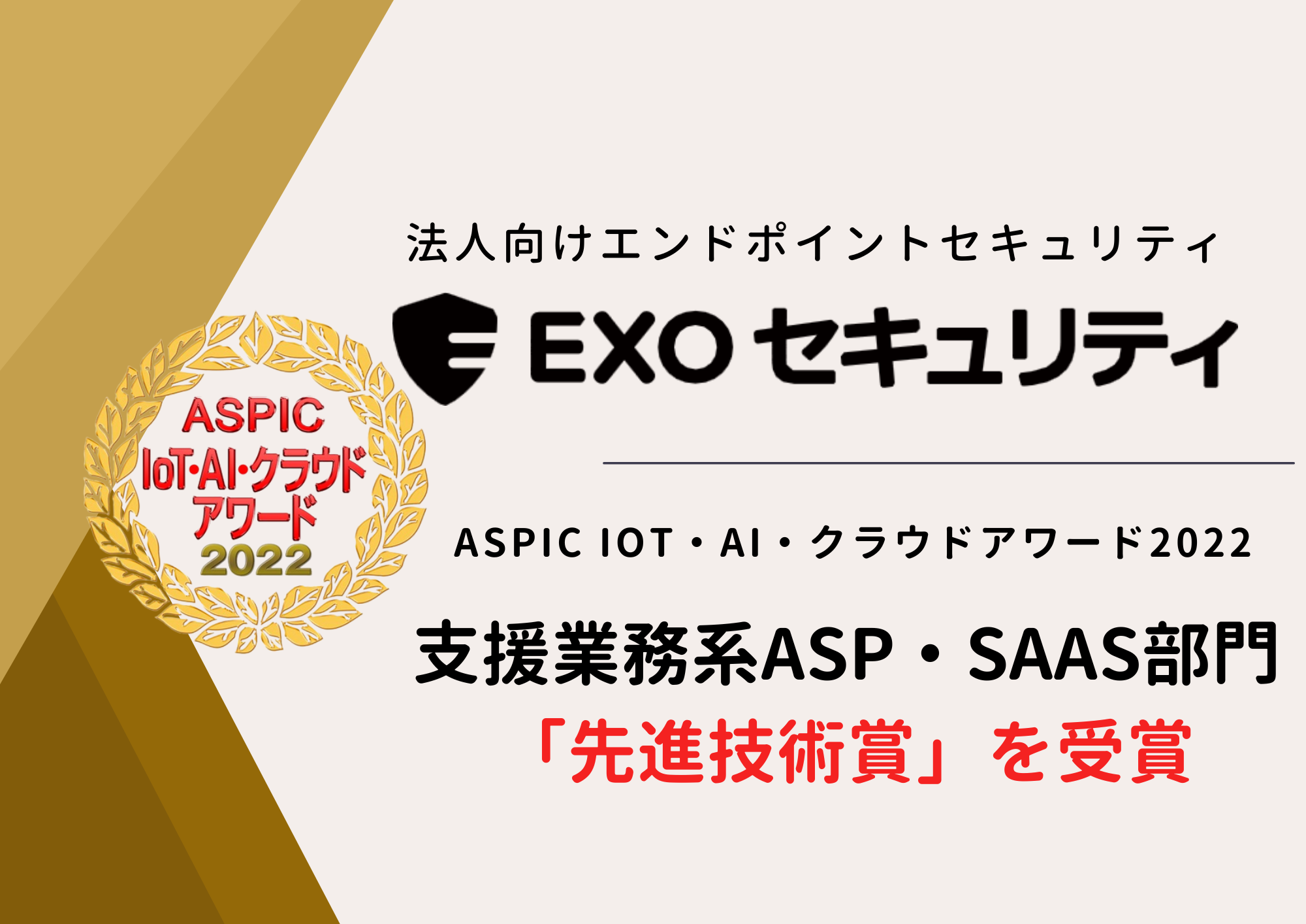 法人向けエンドポイントセキュリティ「EXOセキュリティ」が総務省後援『ASPIC IoT・AI・クラウドアワード2022』にて「先進技術賞」を受賞