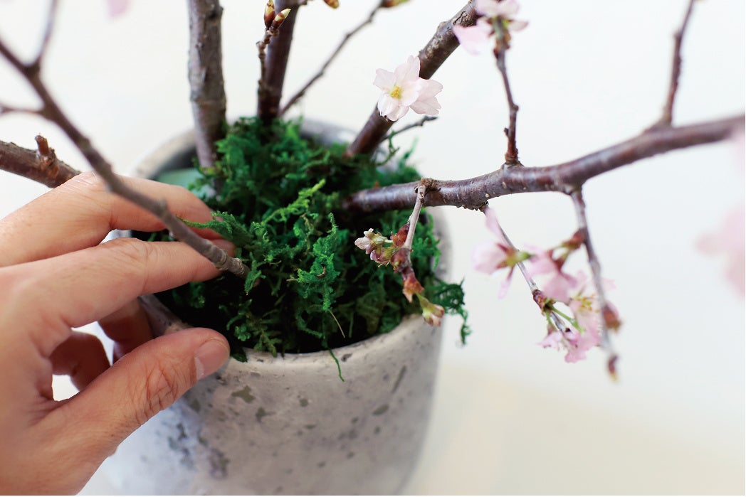 桜の次に小花をいけ、最後にドライモス(苔)をセット。
