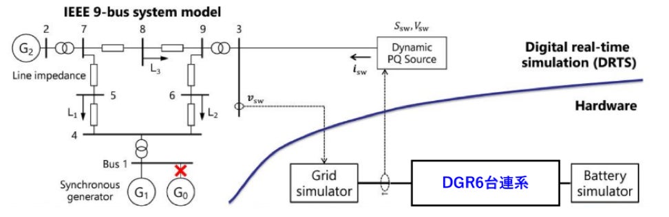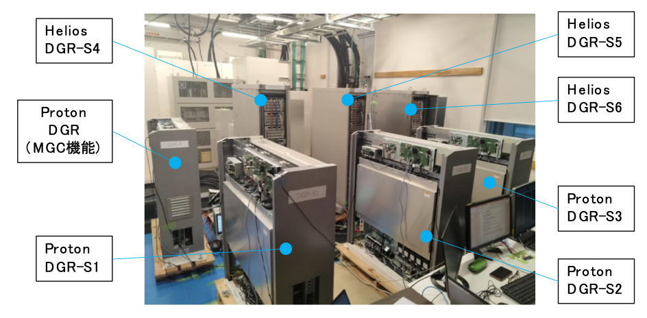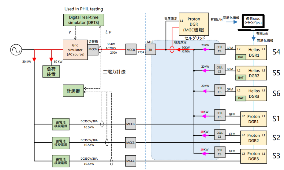 6台のデジタルグリッドルータDGR(20kW機3台、10kW機3台)を並列運転させ模擬電源と直結し、周波数応答・電圧応答・瞬低を評価しました。いずれも設計通りの性能を確認しました。
