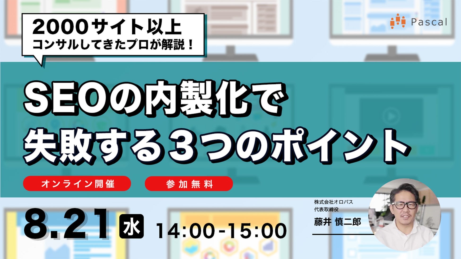 【8/21(水)無料ウェビナー】2000サイト以上をコンサルしてきたSEOのプロが解説!『ありがちだけど皆が知らない、SEOの内製化で失敗する3つのポイント』