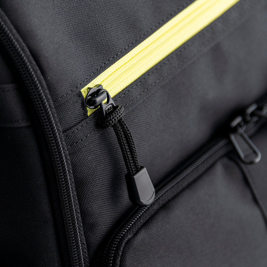 人気のイエローライン。絶妙なワンポイントとして、シンプルなデザインを引き立てています。Lサイズのポケットは、両開きのファスナーにして使いやすく。また、Mサイズよりマチ幅をつけて容量を大きめにしています。