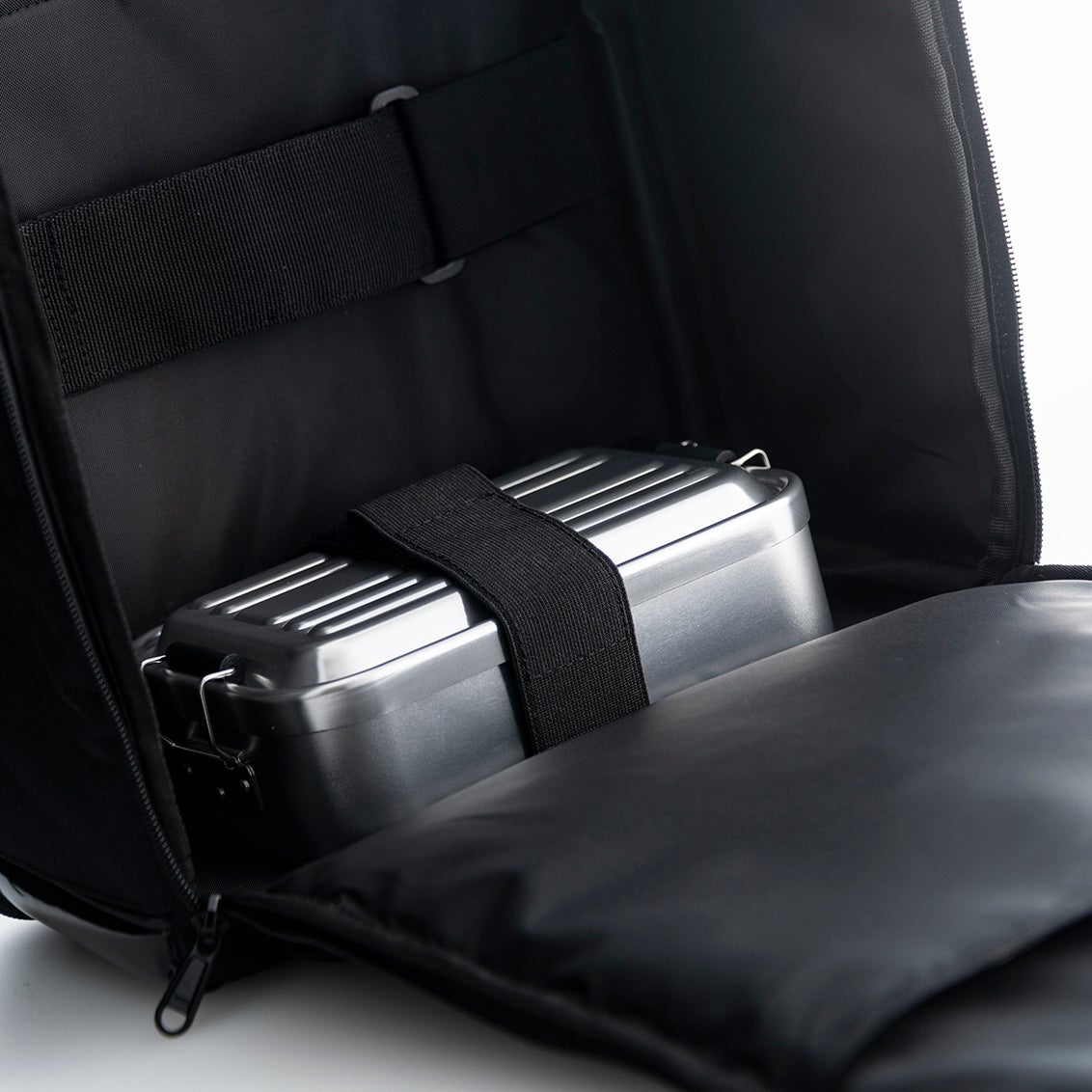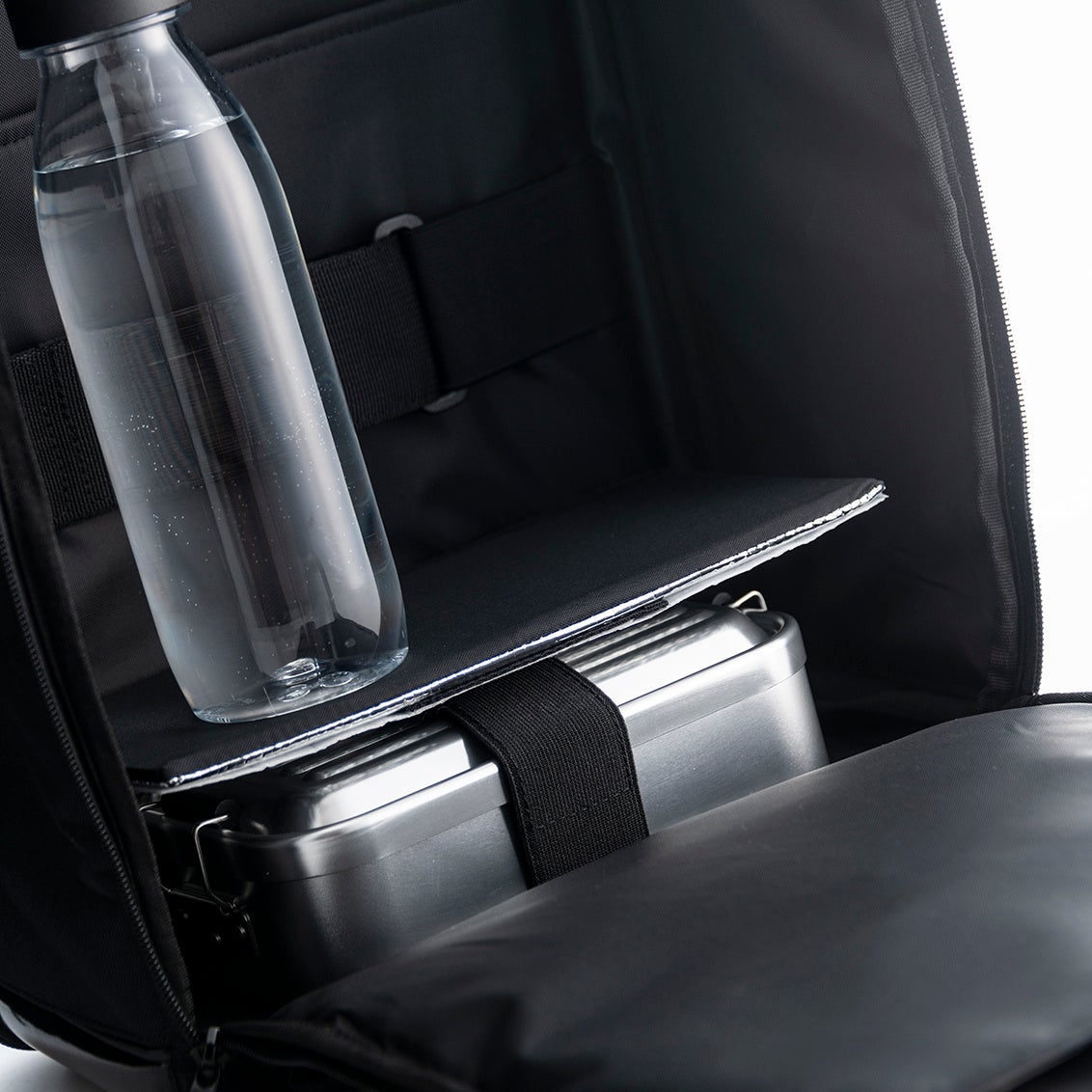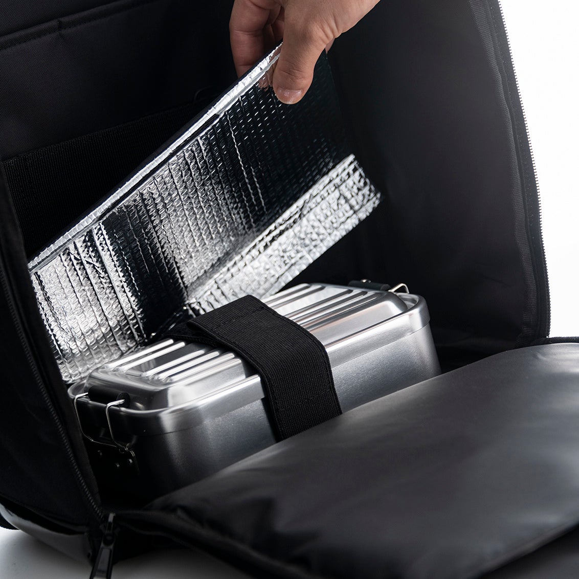 可動式で取り外しができる底板は、マジックテープで好きな高さに調整可能です。弁当箱側には保冷シート、またサイドには保冷剤をいれられるポケットがつきます。