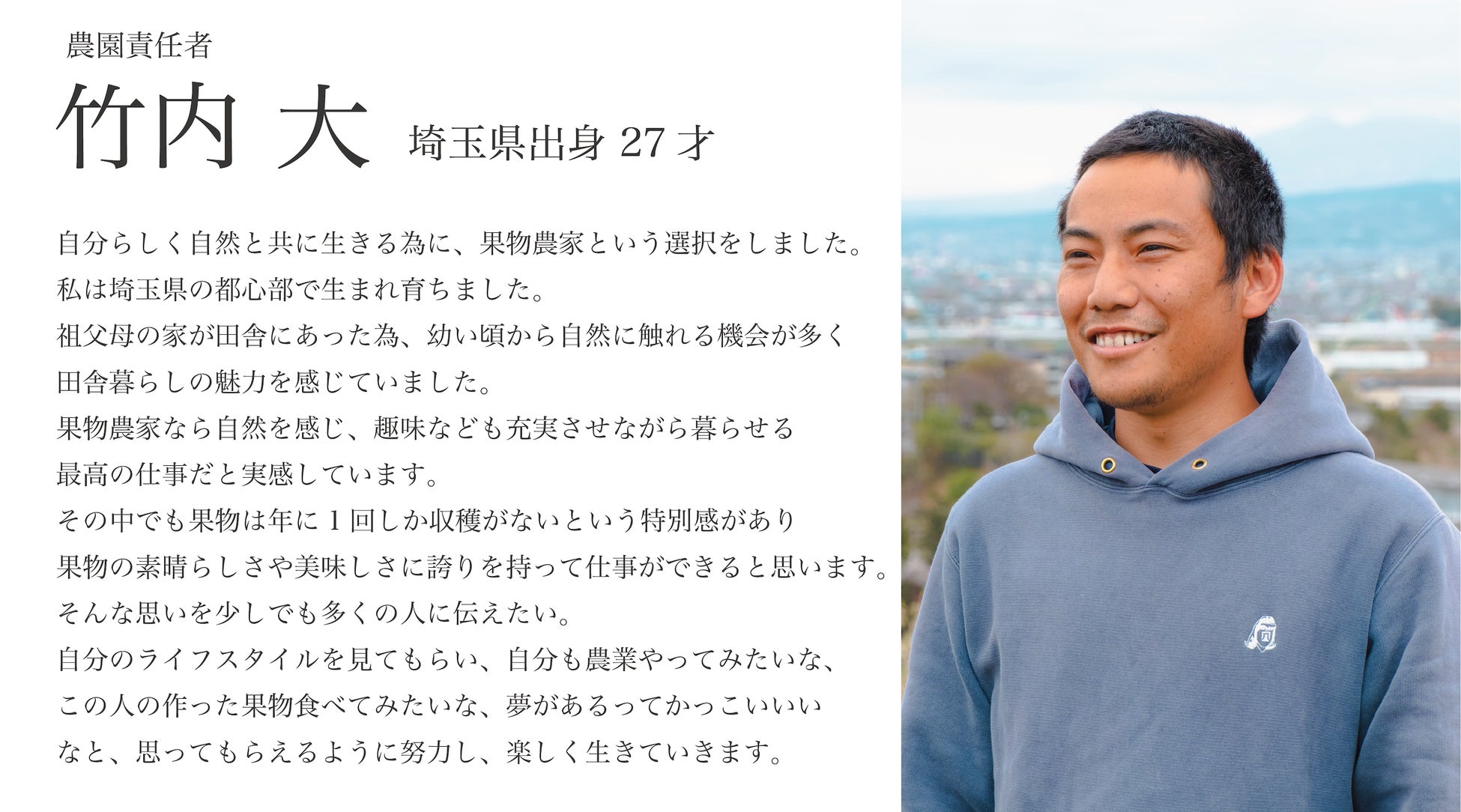 そのうちの1人である竹内は、プログラム市場初の独立農家として、果樹栽培を行っています。