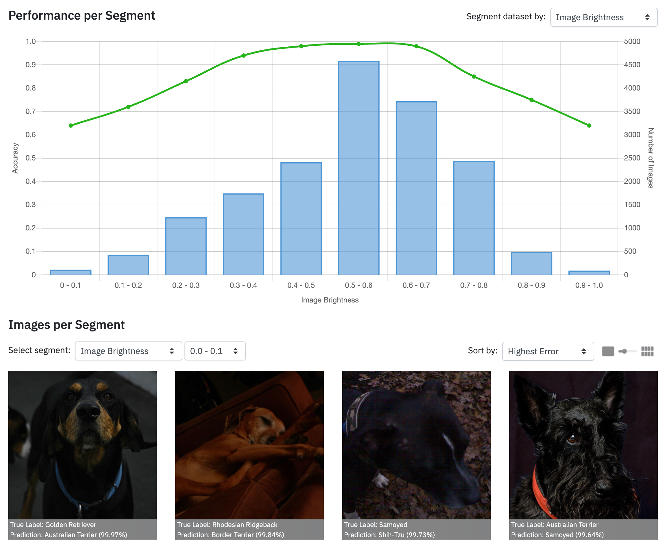 また画像に付加されたメタデータや、画像固有の明るさ等の特徴量を組み合わせ、人手ではなかなか検出できないAIの弱点を、自動的に深堀りして探り出す「バイアスの自動検出機能」を搭載、精度の出ていないデータセグメントを容易に確認することができます。撮影した工場、アノテーター、画像の明るさ等、さまざまな視点から、AIの精度を簡単に分析・比較した上で、再学習すべき画像を炙り出すことが可能です。