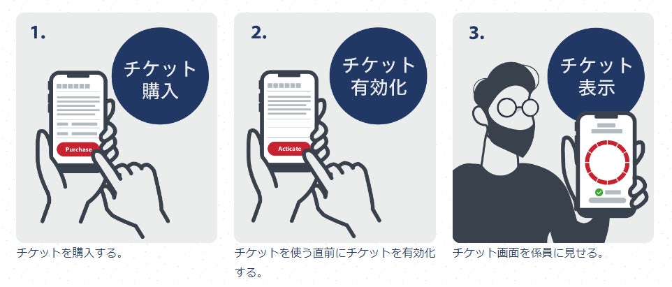購入したチケットを有効化してスマホ画面に表示し、係員に提示します。