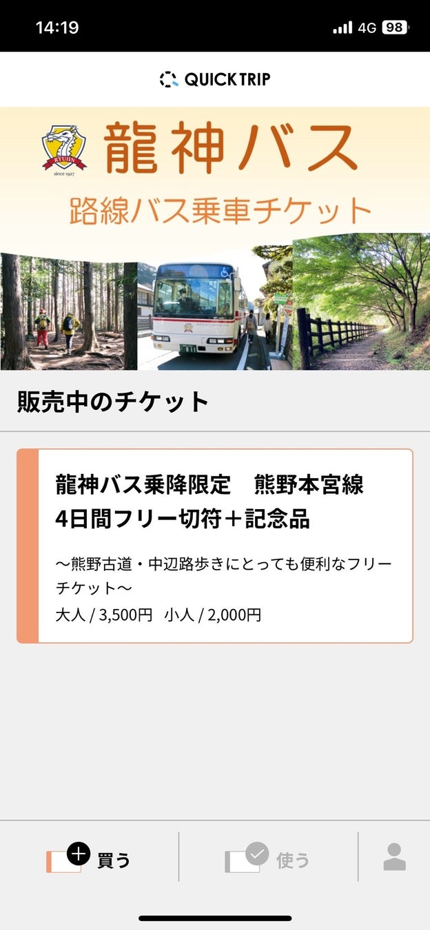 モバイルチケット「龍神バス 熊野本宮線4日間フリーチケット」をQUICK TRIPで販売!