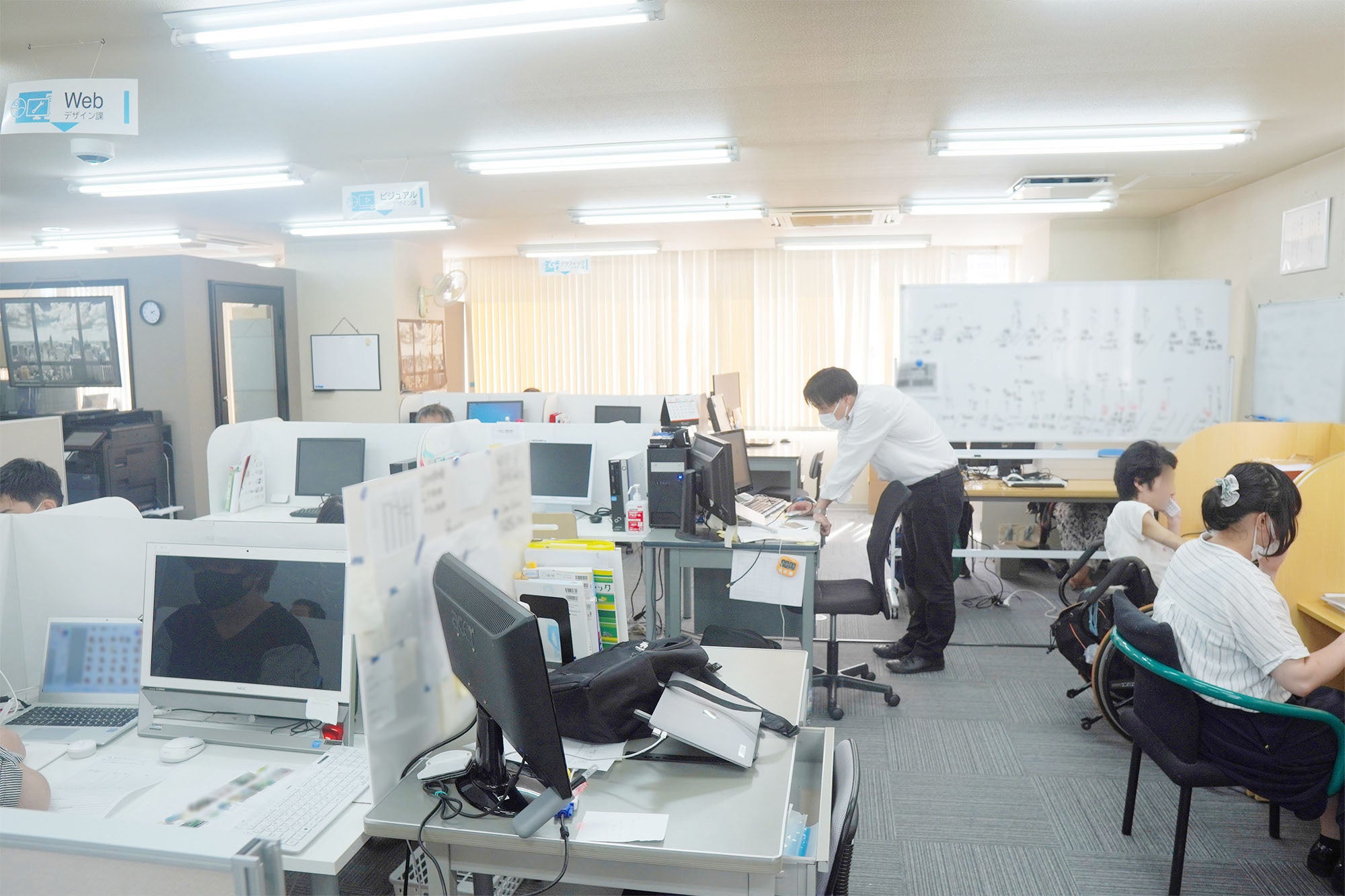 パソコンを使った就労支援事業所として、代表的な同事業所は、「障がい者の方々が社会参加し、働く喜びを知ってほしい」という想いで運営されており、通所者にはそれぞれクリエイター向けのパソコンが貸与されます。