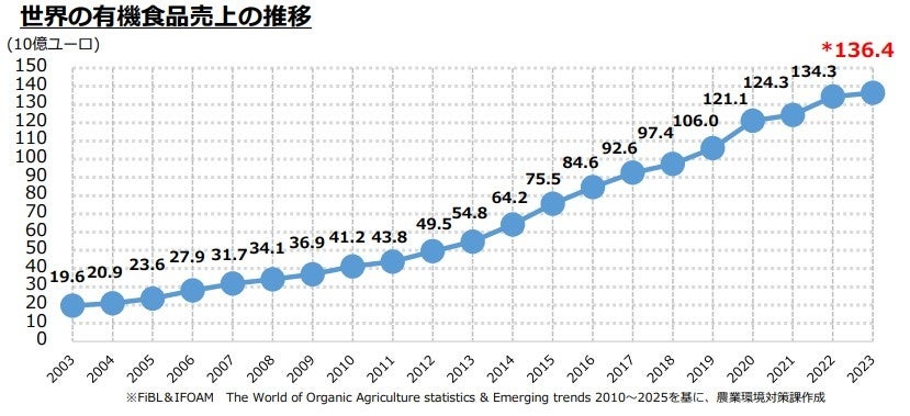 2025年に公開された農林水産省の報告によると、世界を見れば有機食品の市場は北欧諸国を中心に拡大を続けています(図1)。一方で日本は、有機食品を意識的に利用している方は半数未満で、消費額を見ても世界平均以下となっており、まだまだ市場が伸びる可能性を秘めております(図2, 3)。現に、農林水産省の調査では、2009年以降日本全国の有機食品市場規模は拡大を続けており、2030年には3,000億円を超える市場規模にすることが目標として掲げられています(図4)。