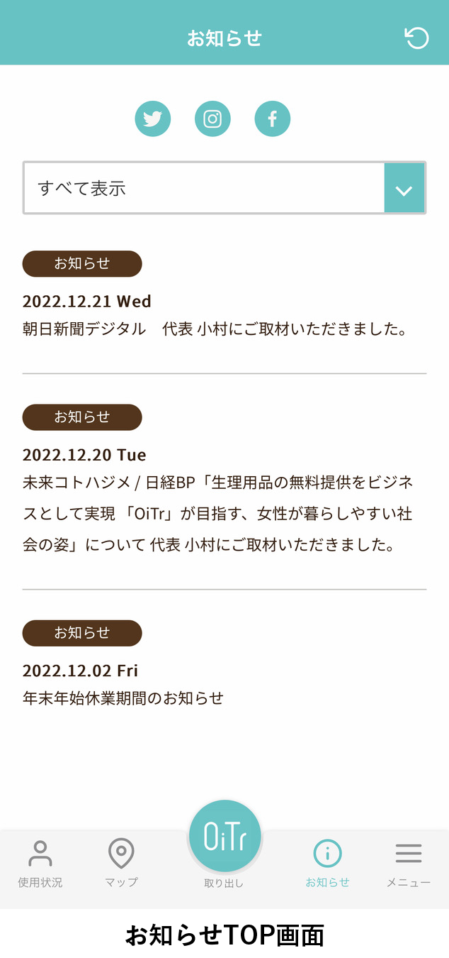 2021年8月末にサービスを本格開始し、現在、全国22都道府県、175施設に2,410台(2022年12月末現在)のOiTrを設置。累計130万枚以上の生理用ナプキンの提供を実現するとともに、この度、専用アプリ「OiTr」が50万ダウンロードを突破いたしました。