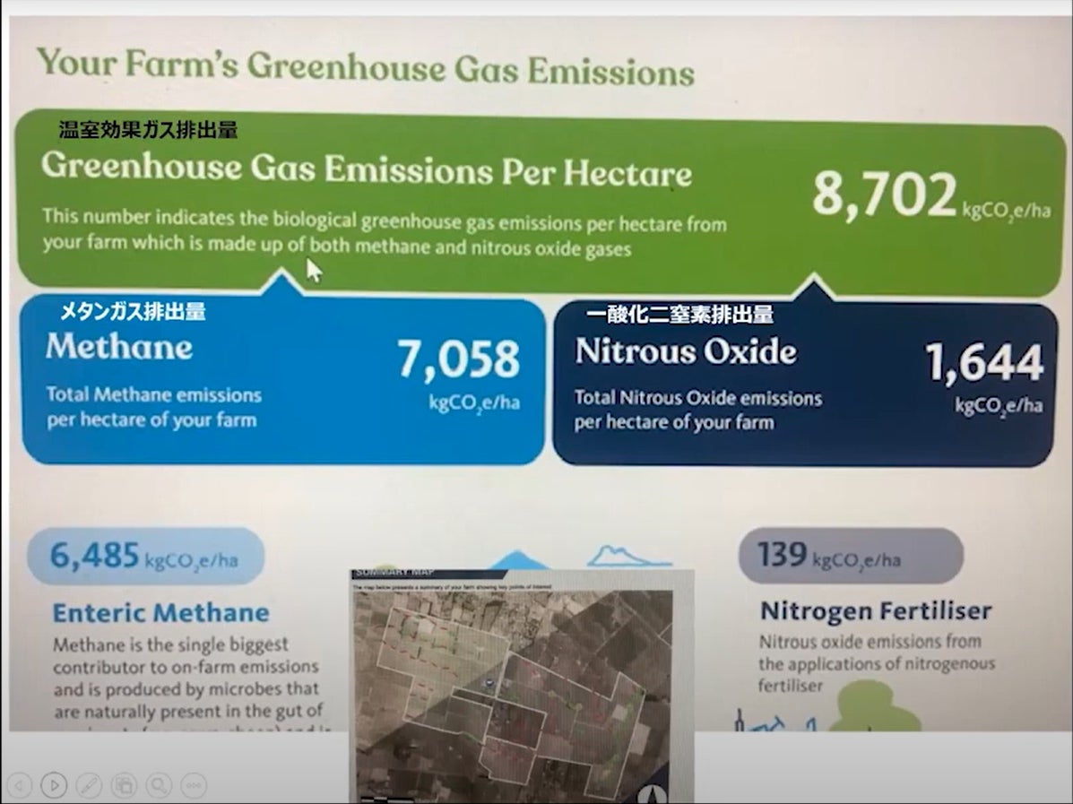 NZでは温室効果ガスの排出量の対策が急がれていて、GreenhouseGas(温室効果ガス)量の報告が環境報告書にて義務化されている。農場をモニタリングして、何が農場に入り、何が出て行っているのかを把握する活動を行っており、今後、温室効果ガス排出量に応じた税金がかかってくる見込みなので、農場にとっても深く関係してくる。さらに水質に関する窒素の出入りの報告も必要である。