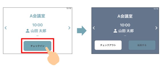 会議室などの部屋の前に設置するタブレット端末によって、入室前に現在の予約状況を確認できます。端末画面上の左右「<」「>」を押下することで、前後の予約状況もその場で確認でき、スムーズな会議の始まりをサポートします。さらに、会議室の利用開始時のチェックイン/利用終了のチェックアウトの操作に加え、次の利用予約がされていない場合は利用予約の延長も端末上で行うことができます。