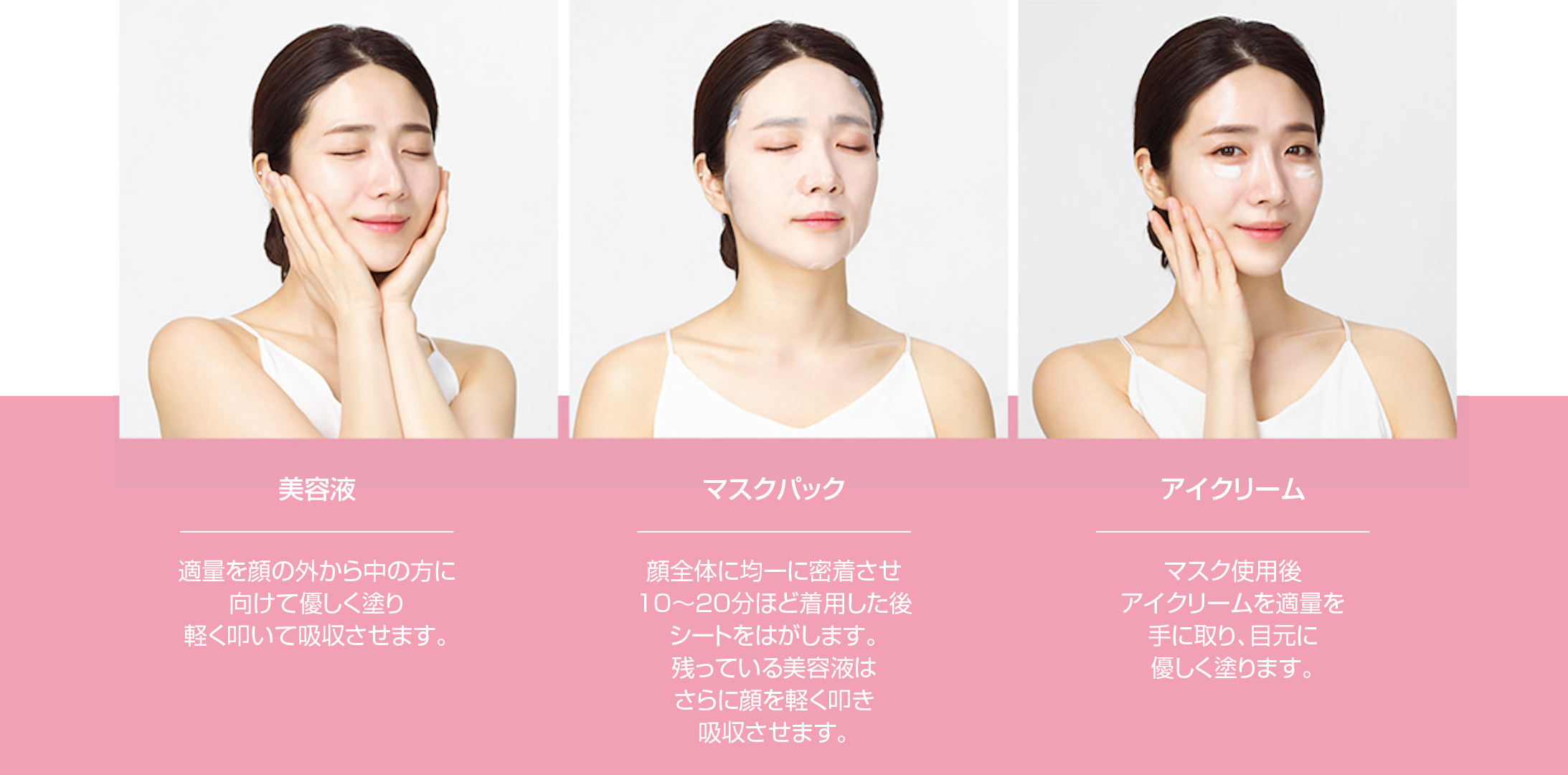 美容液 → エッセンスマスク → アイクリームの3ステップが1枚に収まった設計で、目元までしっかりケアできます。
