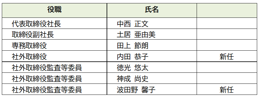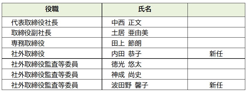 本体制変更に合わせて、フリーアナウンサーでありマインドフルネストレーナーとしても活躍する内田恭子氏が社外取締役に、弁護士として企業法務を中心に高い専門的な知識・経験及び複数のベンチャー企業の常勤社外監査役や社外取締役の経験を有す波田野馨子氏が社外取締役監査等委員に新たに就任し、役員の女性比率が43%となりました。