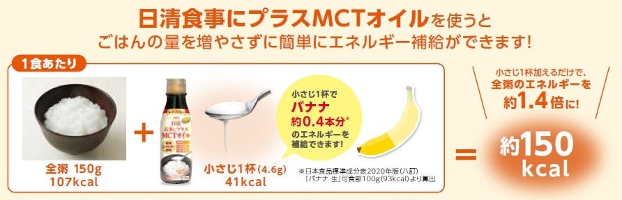 このようなエネルギー不足に対し、当社では病院・施設における食事のエネルギーアップで定評のある「日清MCTオイル」の使い勝手をさらに高めた新商品を発売することで、在宅介護でのご利用を視野に、介護に携わる方、高齢者、要介護者の方のさらなる満足度向上を図ります。