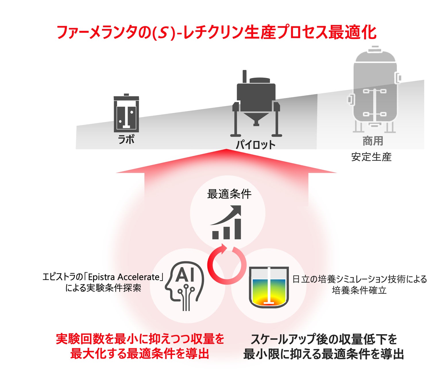エピストラと日立、AIを活用しファーメランタの医薬原料中間体「(S)-レチクリン」の生産において、世界最大級の収量とラボ実験回数の最大73%減を達成