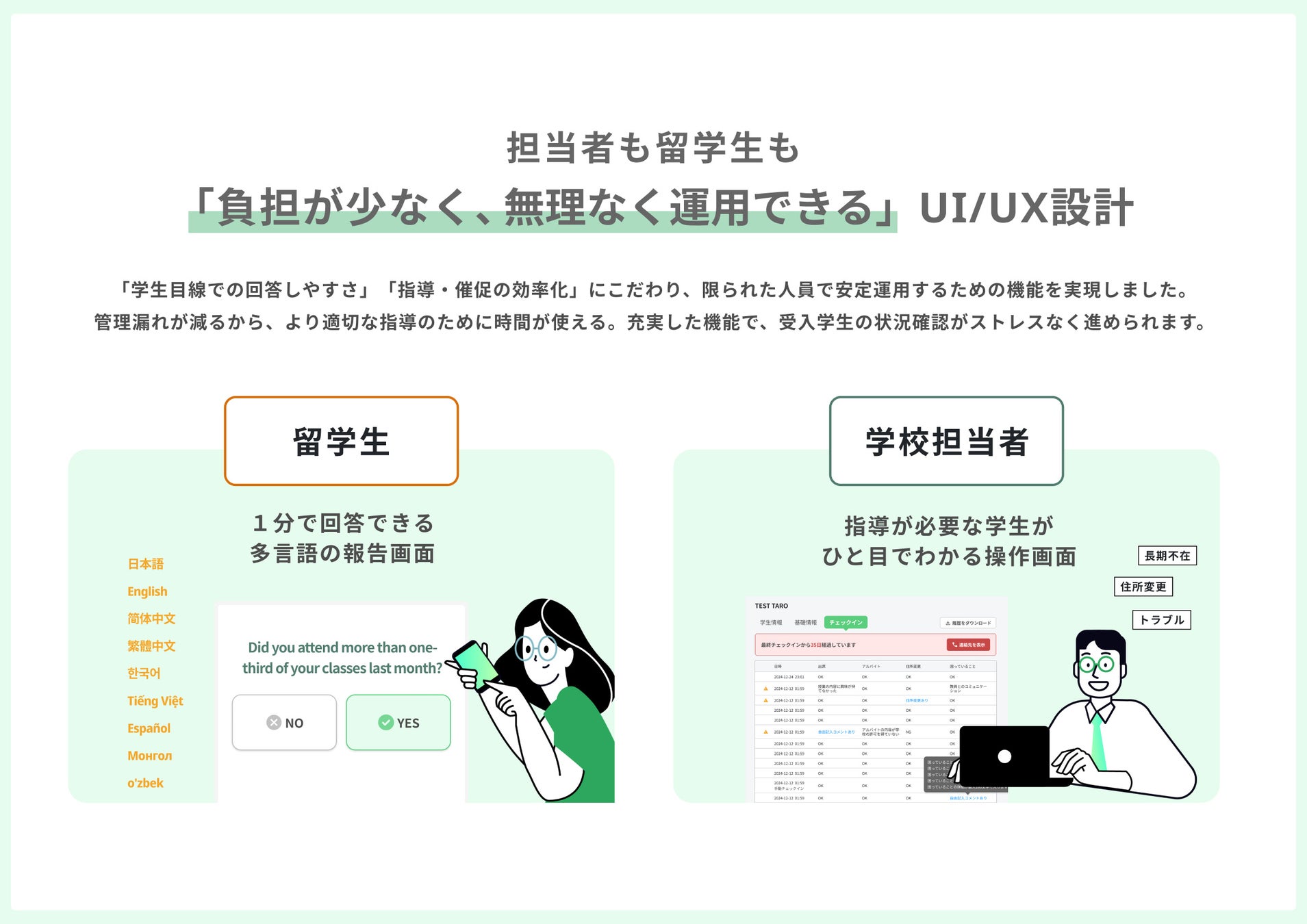 当社は従来の留学生受け入れ業務で感じる「抜け漏れ」や「非効率」といった課題を、シンプルかつ低コストで改善するソリューションとして、教育機関の強力なツールになることを目指してまいります。