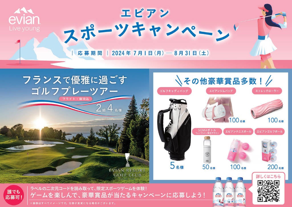 期間限定のスポーツボトルの発売を記念し、スポーツにちなんだ特別な旅や豪華景品が当たる「エビアン スポーツキャンペーン」を7月1日(月)から開始します。抽選で2組4名様に、フランス・エビアンの名門ゴルフクラブでのゴルフプレー券、宿泊、往復航空券などをプレゼントします。さらに、抽選で559名様にゴルフ、テニスなど、スポーツに関連した豪華賞品が当たります。
