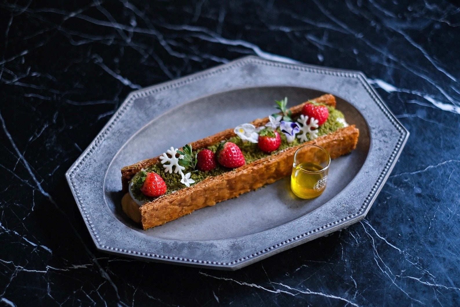 約22cmのパイを立ててサンドするのは、下から自家製カスタードクリーム・ヴァンショー風のベリーソース・バニラシャンティ。上にはピスタチオクラムをのせて畑に見立て、エディブルフラワーやマジョラムで緑やお花を咲かせます。また「セドリック カサノヴァ」の樹齢400年の古木のパワーを感じる黄金色のシチリア産オリーブオイル「MAMUN」を添えてお楽しみいただきます。