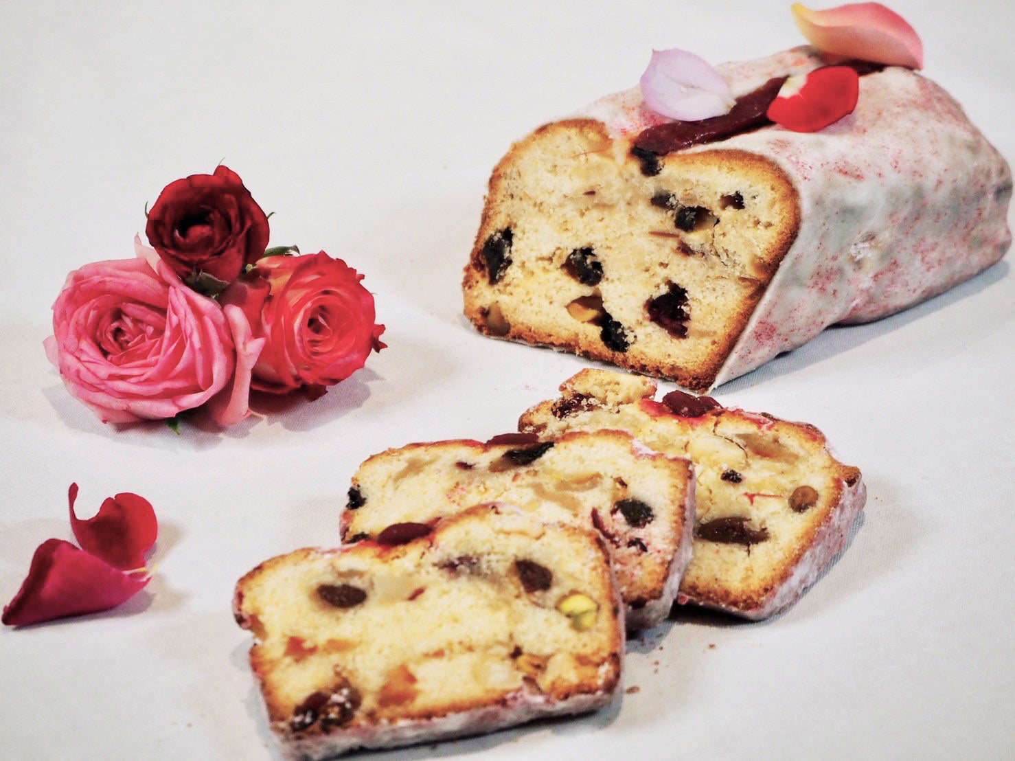 クリスマスに向けて少しずつ食べ進める習慣で知られるドイツ発祥の菓子パン“シュトーレン”をテーマに、生地にはたっぷりのドライフルーツとナッツに加え、100パーセント農薬不使用の食べられる花を栽培する「エディブルガーデン」製ローズジャムとローズウォーターを使用。ほんのりと上品なバラの香りを感じていただけます。