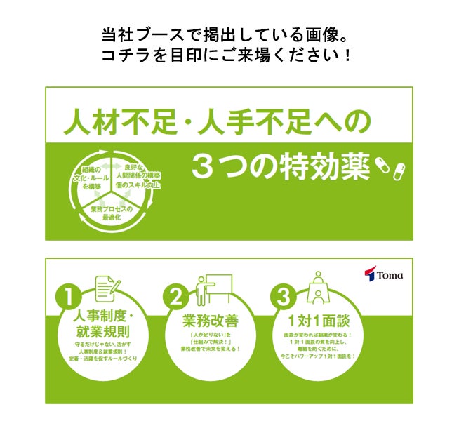 そこで、人材不足・人手不足に悩む企業・団体に最適なソリューションを提供する本展示会にて、当社の社会保険労務士、IT・業務改善コンサルタント、人材・組織開発コンサルタントが直接相談対応し、各企業にとって適切な「3つの特効薬」(①人事制度・就業規則 ②業務改善 ③1対1面談)をご提案いたします。是非ブースおよびセミナーにお立ち寄りください。