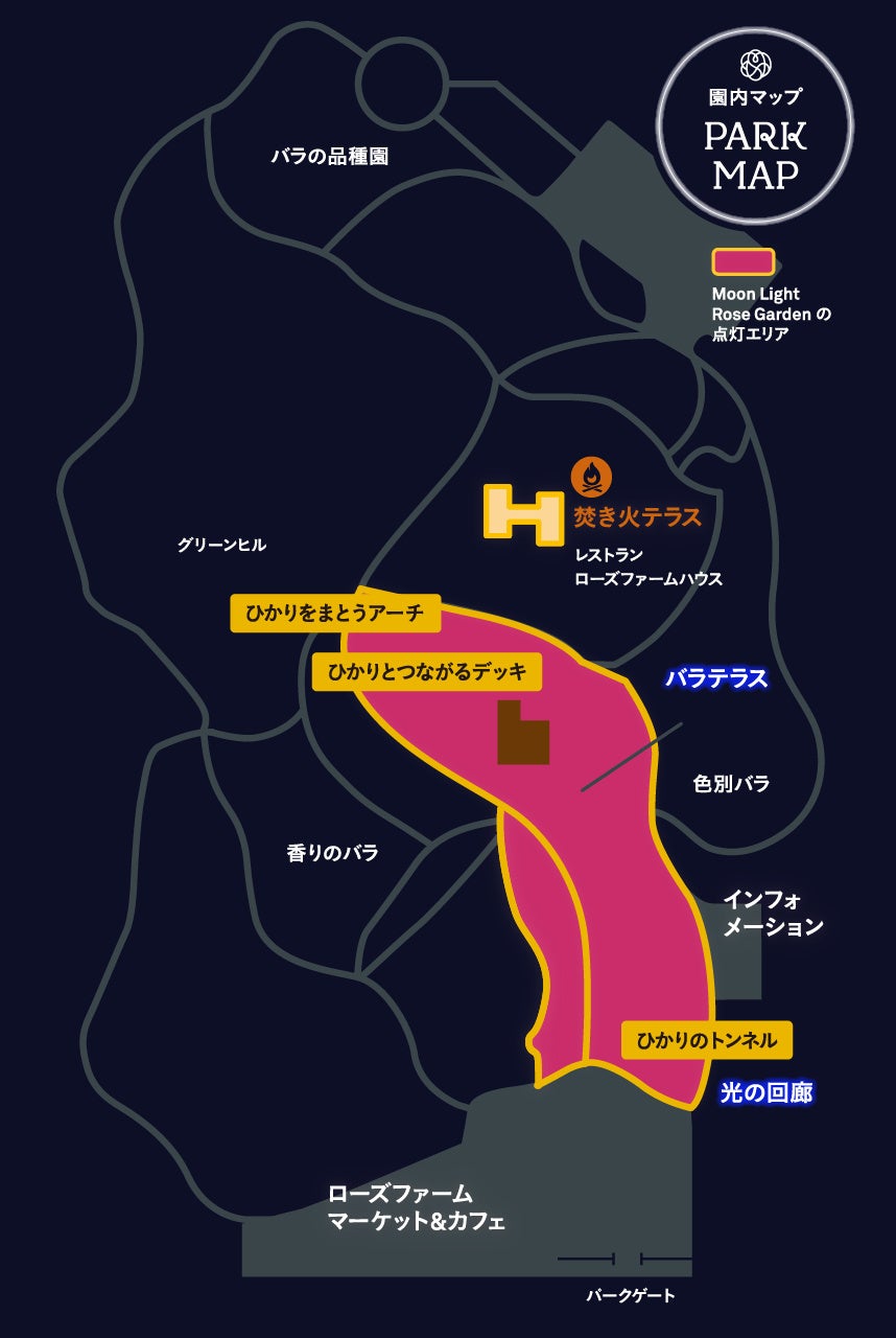 月明かりに浮かぶ、バラの美しさを感じるバラテラス。園内中央、丘の上にあるレストランのテラスから里山とバラの絶景を眺めることができます。風にそよぐような光のさざなみが、秋バラをライトアップします。