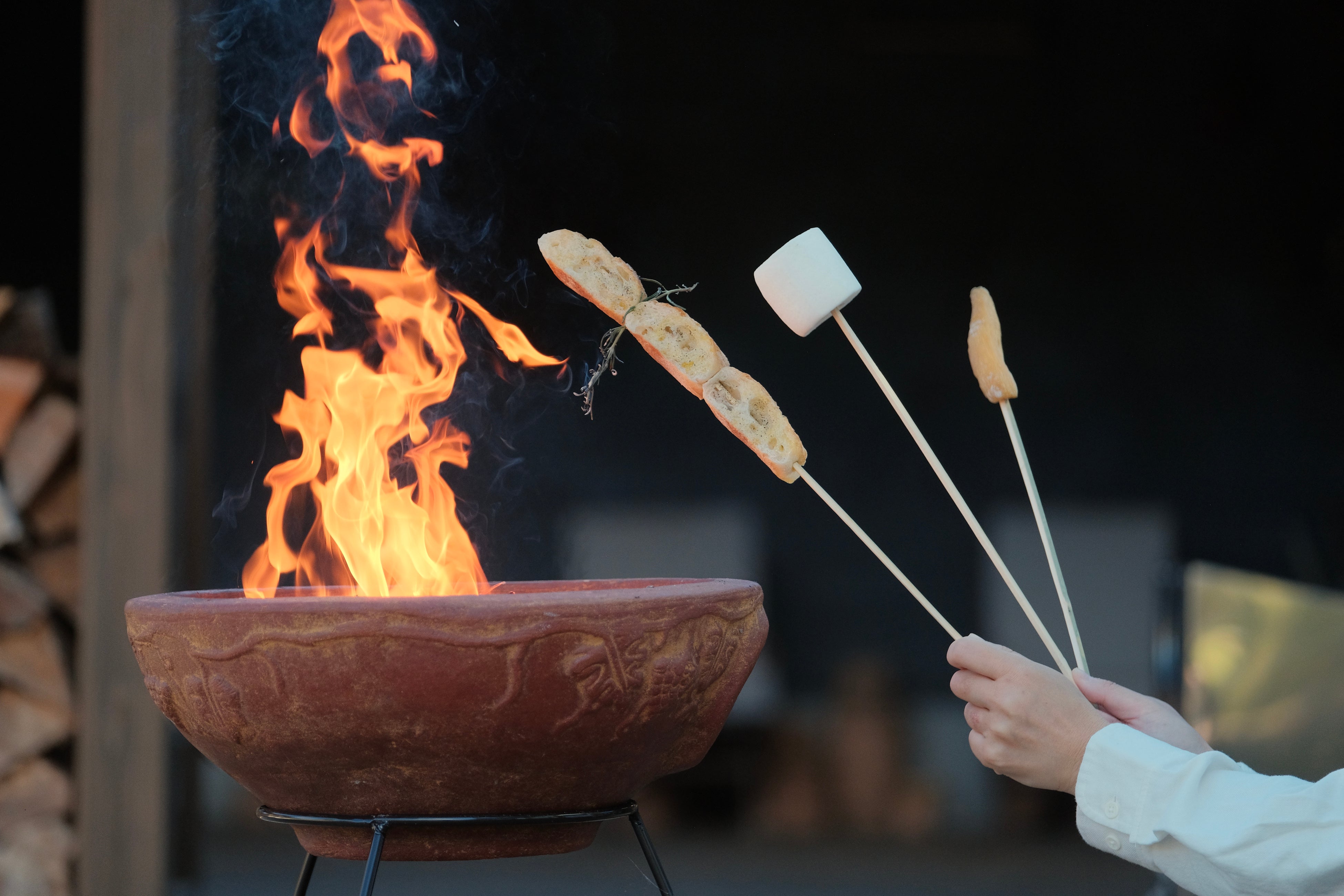 レストランのテラスでは、焚き火を囲んで楽しむ“焚き火”メニュー、干し芋やマシュマロなどをご用意します。ご自身で焼いてお召し上がりいただくので、みんなでワイワイとお楽しみいただけるのが魅力です。