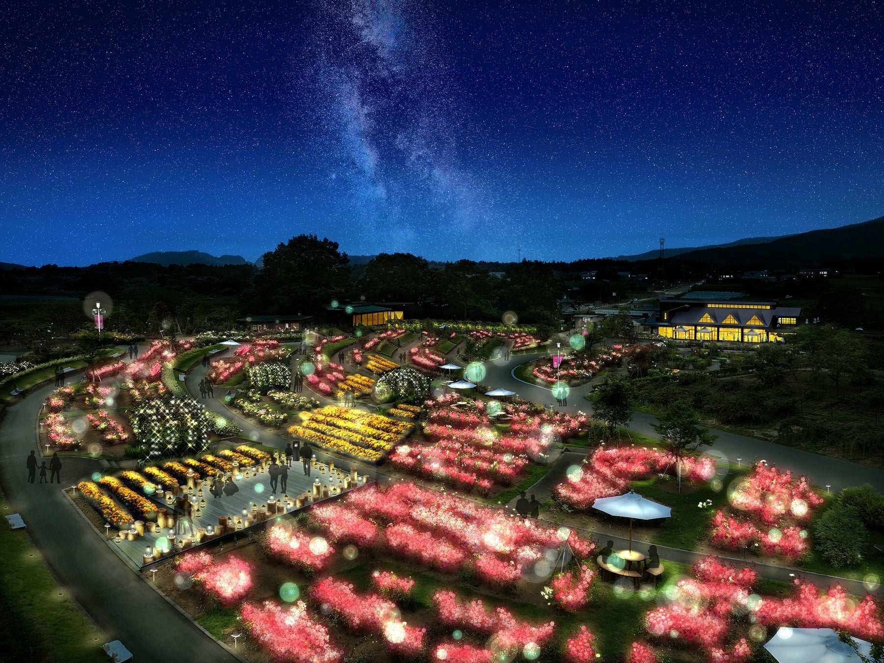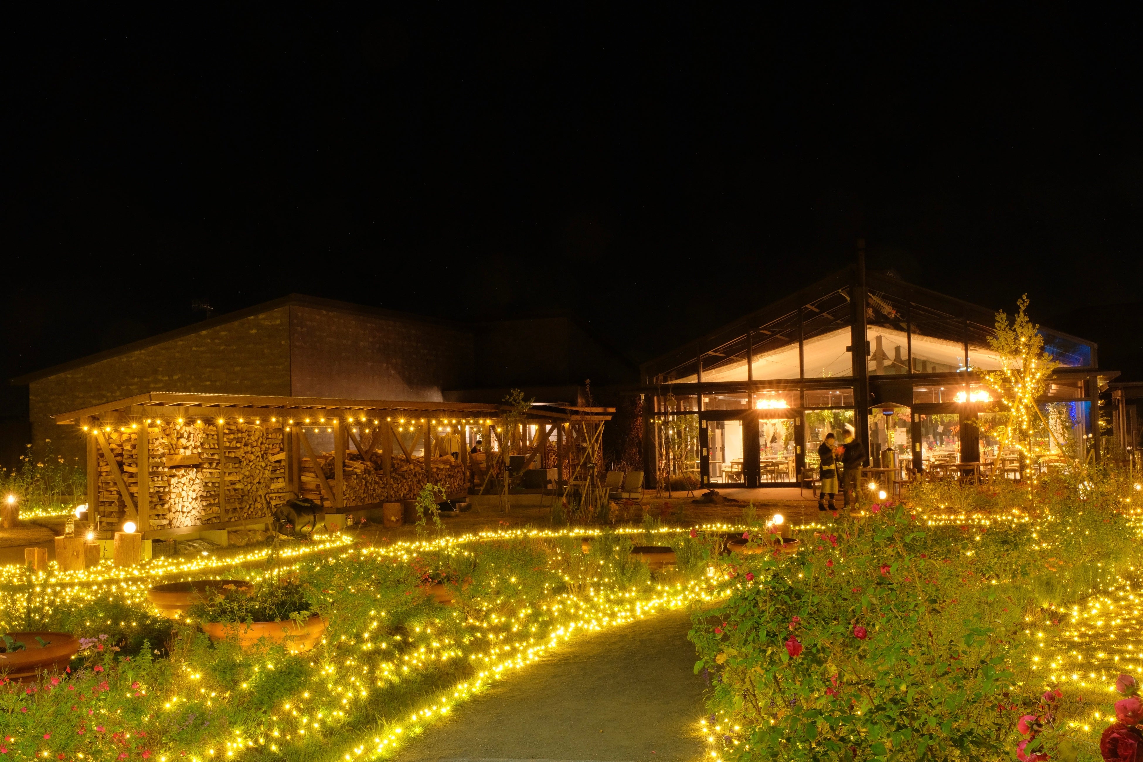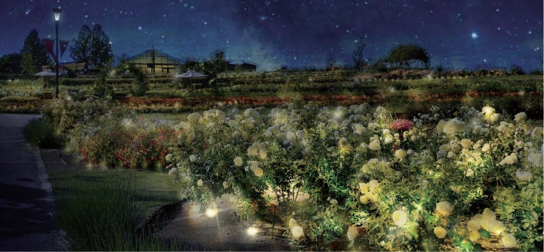 秋の夜長、星が煌めくバラ園で、筑波山麓の稲穂をそよがせる風のような光と出会う幻想的な一夜をお過ごしください。