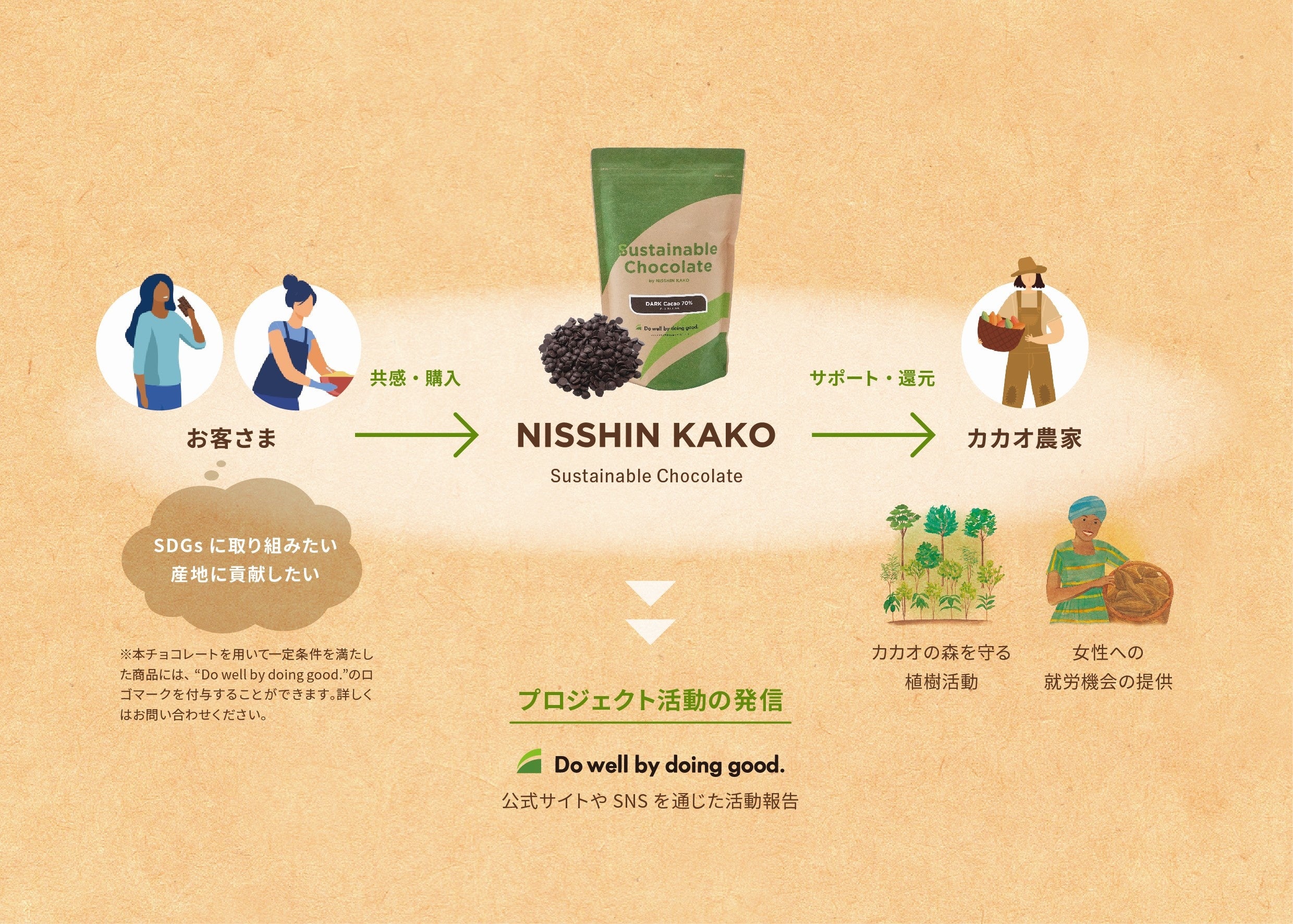 チョコレートを通じて、みなさまの「おいしい」がカカオ豆の生産に関わる人たちやその周りの環境にとっての「うれしい」につながるサステナブルな取り組み